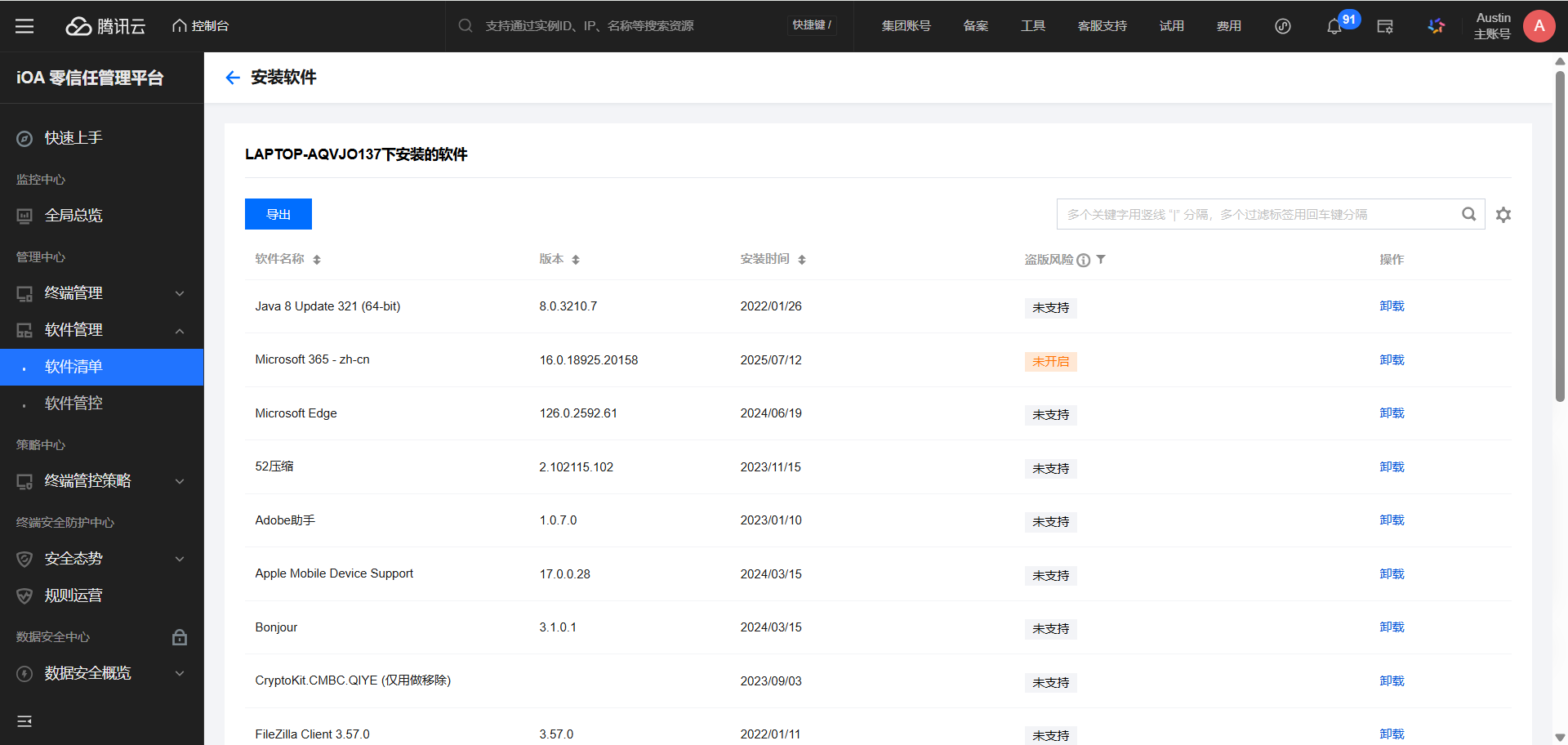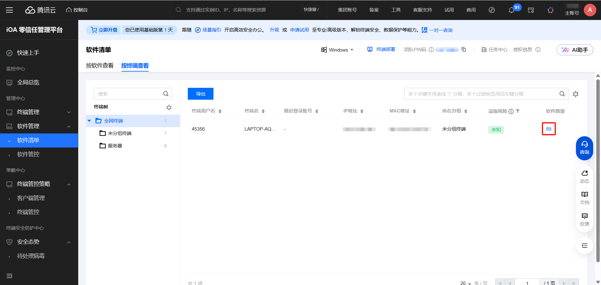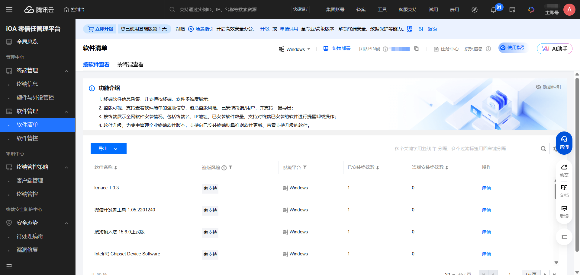 在软件管理-软件清单里面,按软件查看可以筛选出终端上安装了哪些软件。