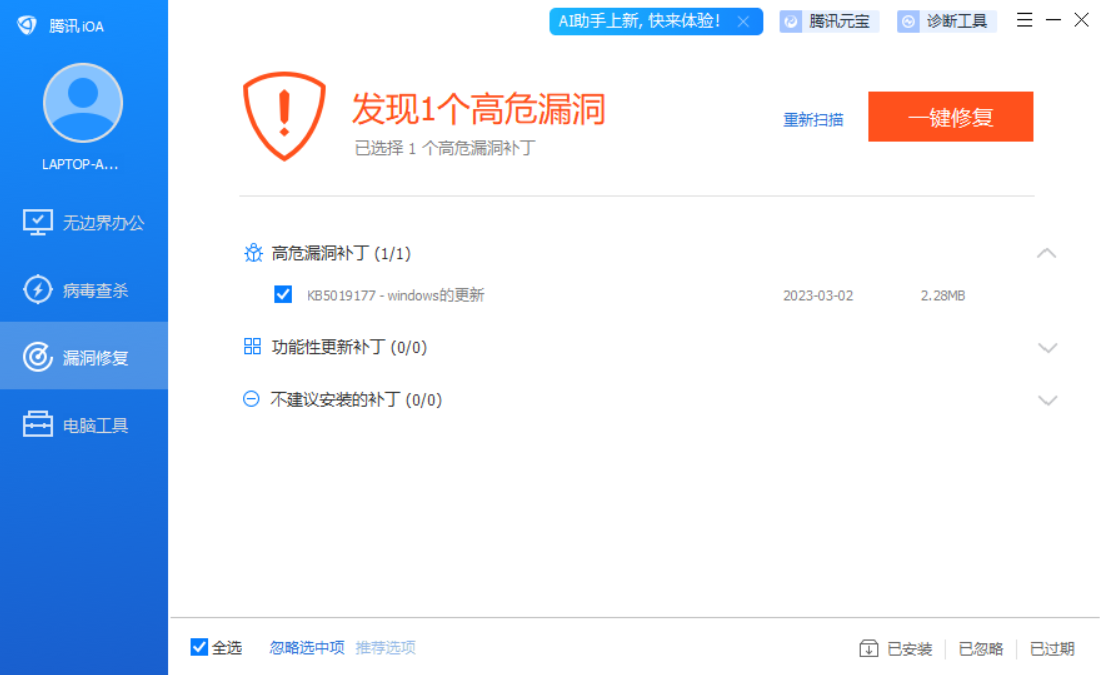 发现1个高危漏洞,点击一键修复。