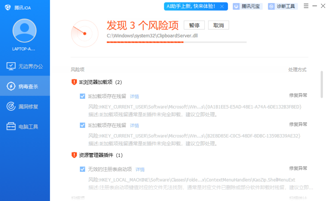 最绝的就是安全态势,包括待处理病毒和漏洞修复,先看待处理病毒,这里会列出所有待处理病毒,选择病毒进行扫描。
