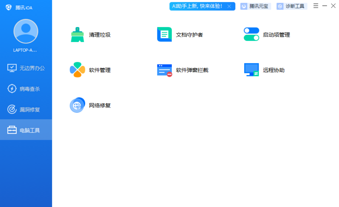 这个功能就丰富了,清理垃圾、文档守护者、启动项管理、软件管理、软件弹窗拦截、远程协助、网络修复。