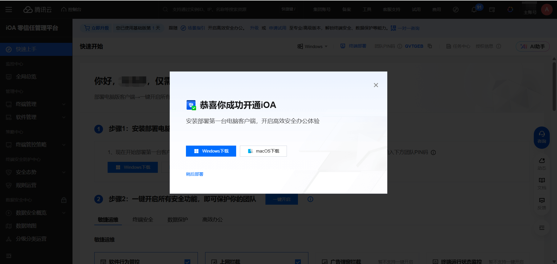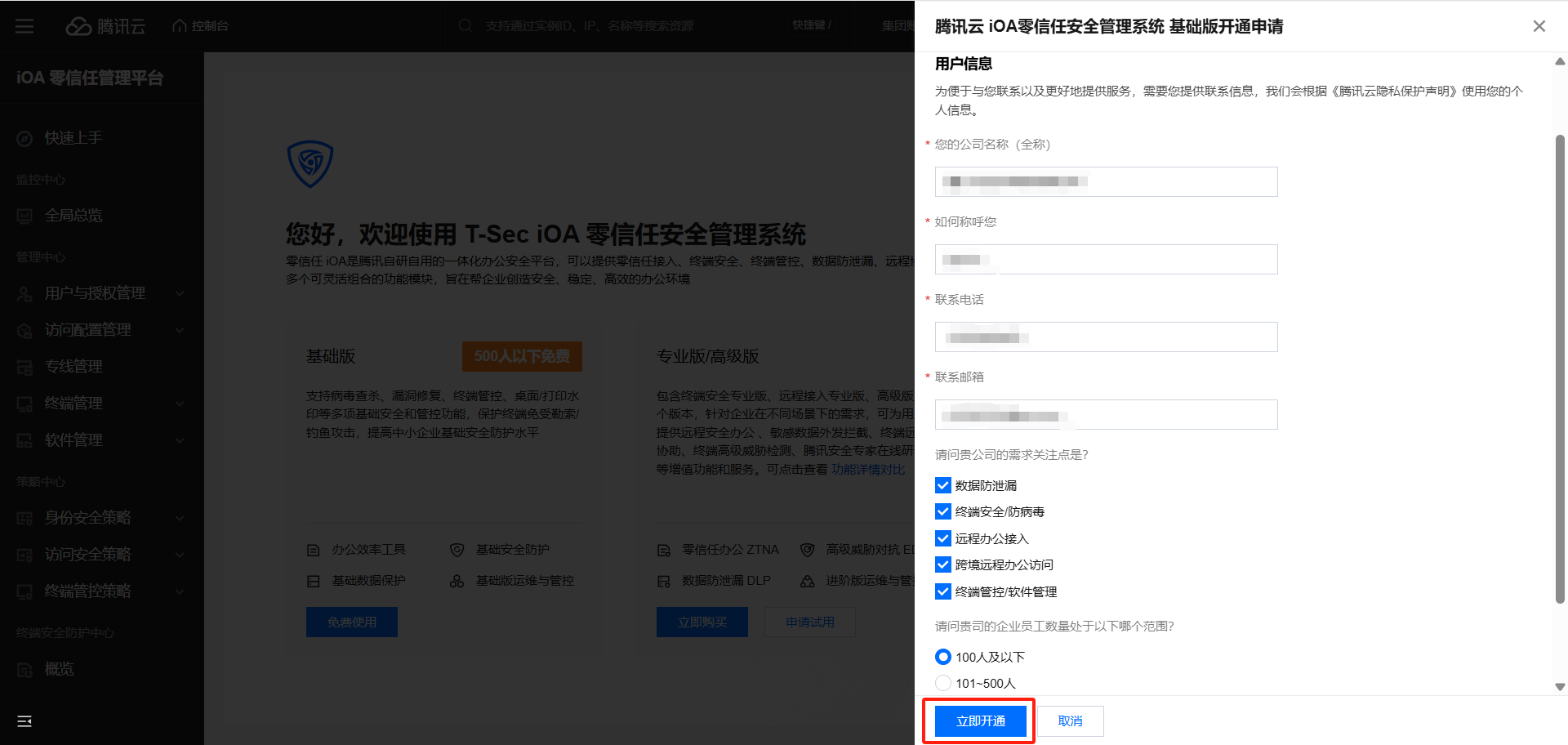 来到iOA零信任管理平台,填写这些信息后,点击立即开通。