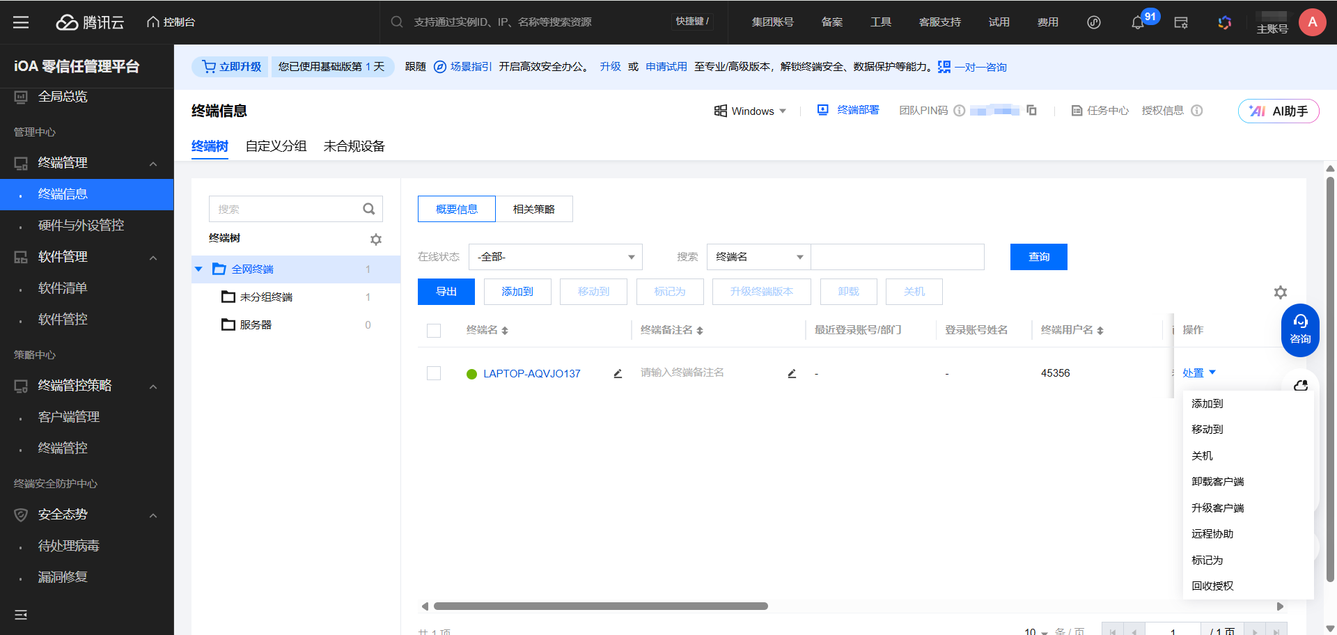 再来看终端管理-终端信息,点击终端名,可以查看该终端的全部详细信息,包括基础信息,运行监控,可信接入,相关策略。右边“操作”菜单下面还有很多个二级按钮,像关机、卸载之类。