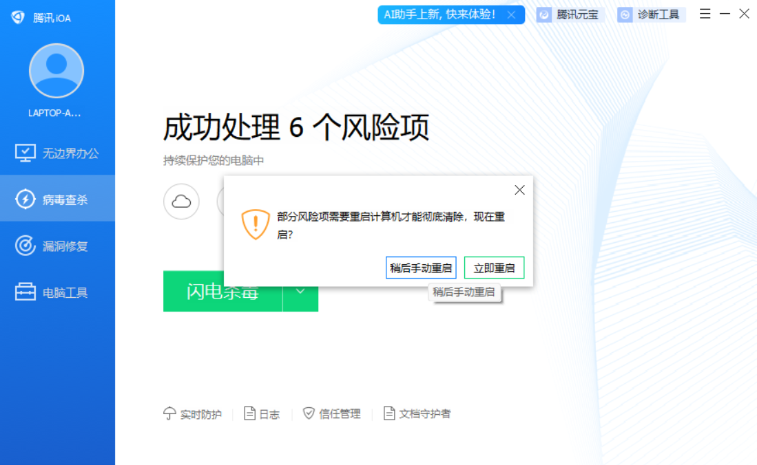 很快就查杀完成了,6个风险项,点击立即处理。