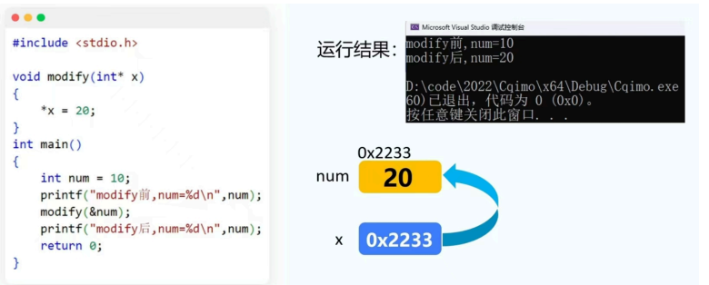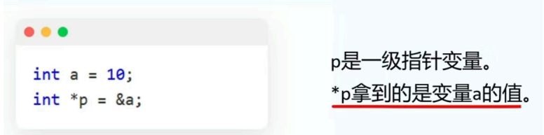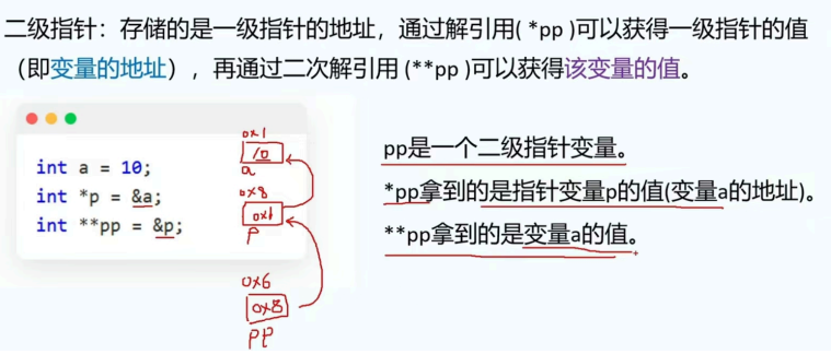 一级指针:存储的是变量的地址,通过解引用(*p)可以获得该变量的值
