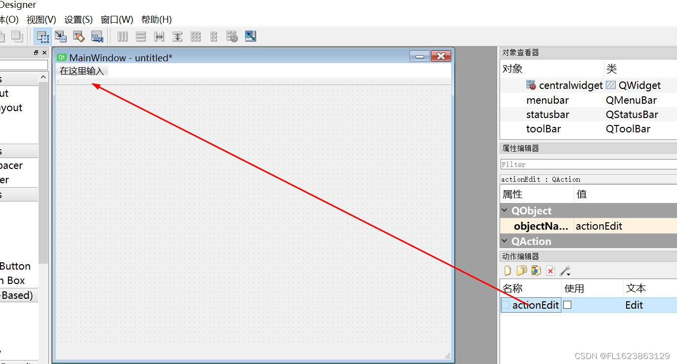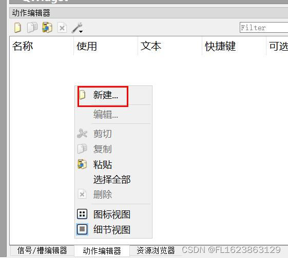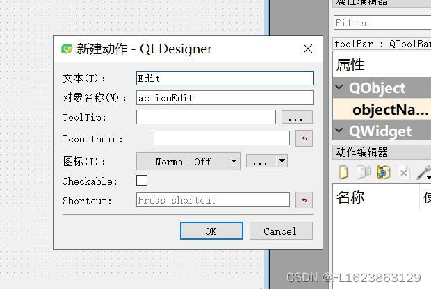 点击Ok后动作编辑器会多出一行,我们直接把名称用鼠标左键按住不动往工具栏拖拽
