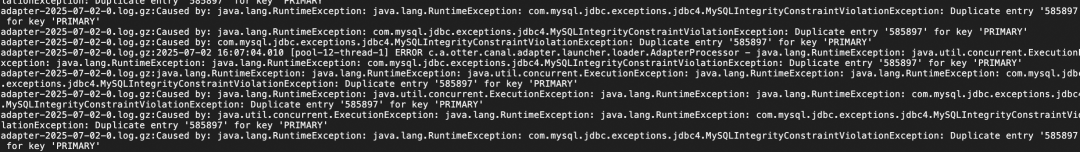 }逻辑就是捕获DuplicateKeyException异常,然后执行update操作。然后本地重新打包覆盖原来的canal-adapter包,重新启动服务即可。