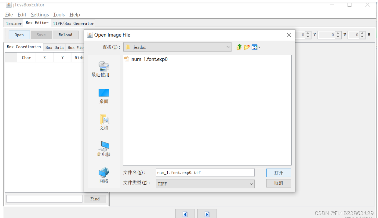 选择好了后,点击打开按钮,出现文件保存对话框,输入文件名:num_1.font.exp0.tif
