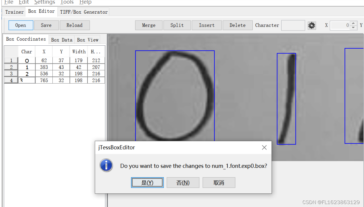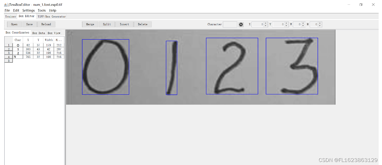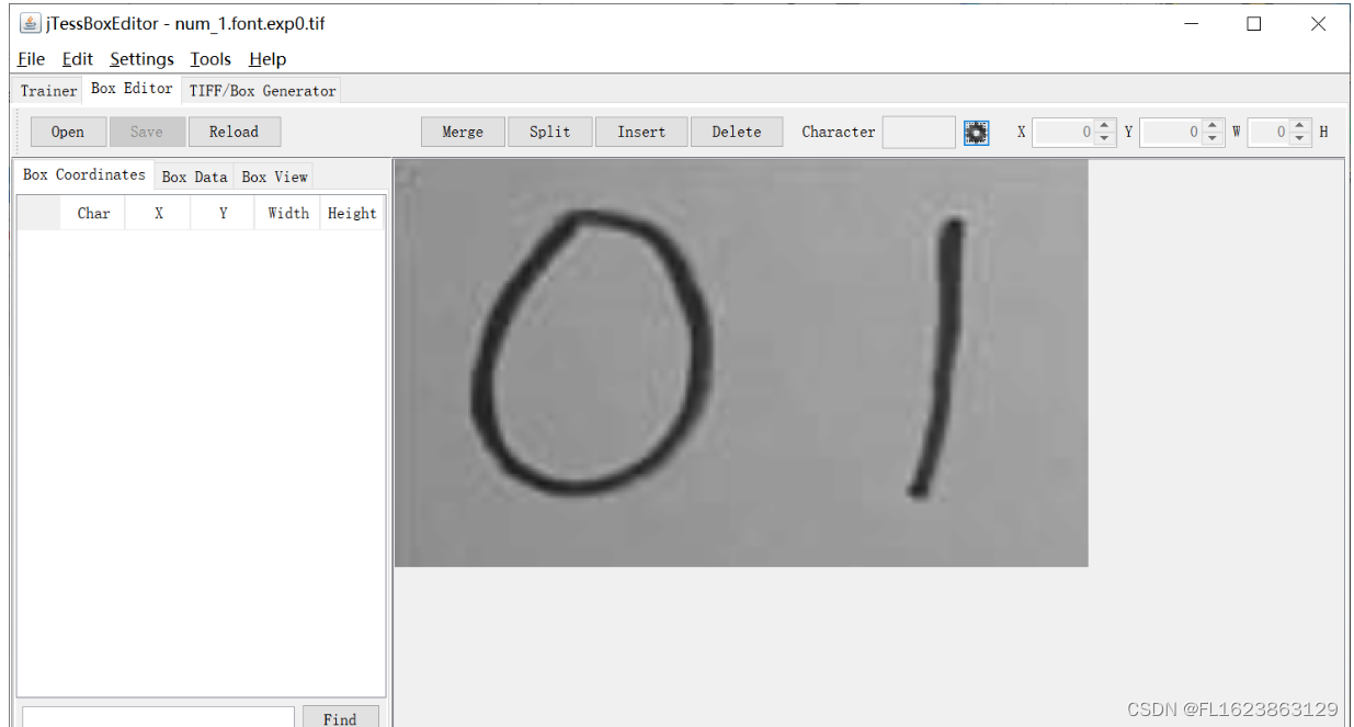 使用jTessBoxEditor调整.box训练文件 .box文件中记录了每个字符在图片上的位置以及识别出的内容,训练之前需要使用jTessBoxEditor调整字符的位置和内容。 打开 jTessBoxEditor ,点击 Box Editor -> Open ,打开步骤2中生成的 “num_1font.exp0.tif” ,会自动关联到 “num_1.font.exp0.box” 文件: