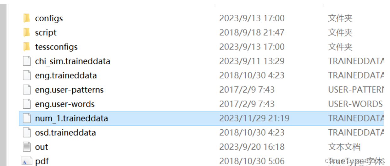 生成字库文件成功,会在当前目录生成num_1.traineddata文件,这个语言就是跟我们下载的官方字库一样,例如eng,chi_sim一样,不过这个字库专门用于识别图片中那种数字字体。