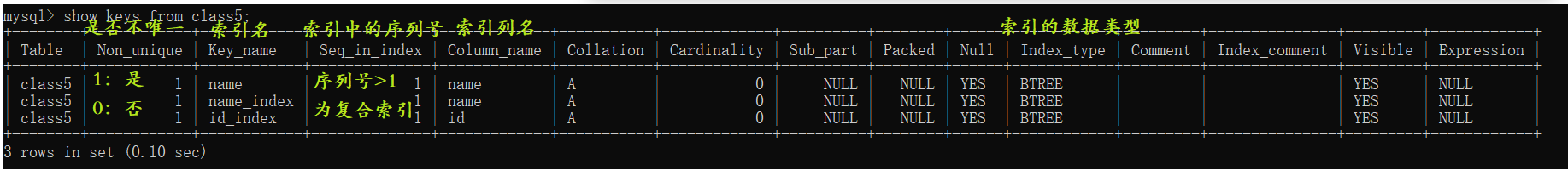 2 rows in set (0.00 sec)当在一个表上定义一个主键primary key时,自动创建索引,索引的值是主键列的值,主键的索引的列值不能为空且必须唯一,InnoDB使用它作为聚簇索引。