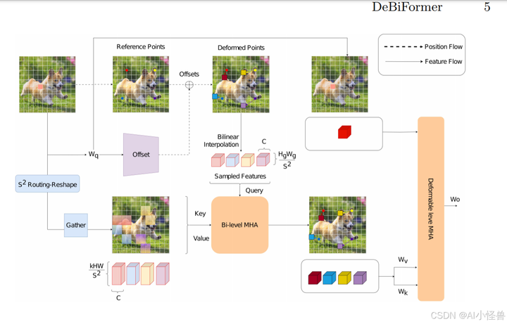 为了提高查询的注意力效率,我们提出了可变形双级路由注意力(DBRA),这是一种用于视觉识别的注意力内注意力架构。在DBRA的过程中,第一个问题是如何定位可变形点。我们利用了[47]中的观察结果,即注意力有一个偏移网络,它以查询特征作为输入,并为所有参考点生成相应的偏移量。因此,候选的可变形点会向重要区域移动,具有高度的灵活性和效率,以便捕获更多信息丰富的特征。第二个问题是如何从语义相关的键值对中聚合信息,然后将这些信息广播回查询。因此,我们提出了一种注意力内注意力架构,该架构如上所述,向可变形点移动,作为查询的代理。当为可变形点选择键值对时,我们使用[56]中的观察结果,通过关注top-k路由区域来选择一小部分最语义相关的键值对,这些键值对是某个区域仅需要的。然后,在选择了语义相关的键值对之后,我们首先应用一个以可变形点查询为条件的token到token的注意力机制。接着,我们应用第二个token到token的注意力机制将信息广播回查询,在这个机制中,可变形点作为键值对被设计来代表一部分语义区域中最重要的点。