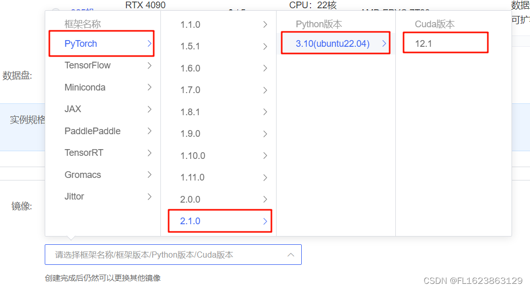 在 Autodl 平台中租赁一个 3090 等 24G 显存的显卡机器,如下图所示镜像选择 PyTorch-->2.1.0-->3.10(ubuntu22.04)-->12.1