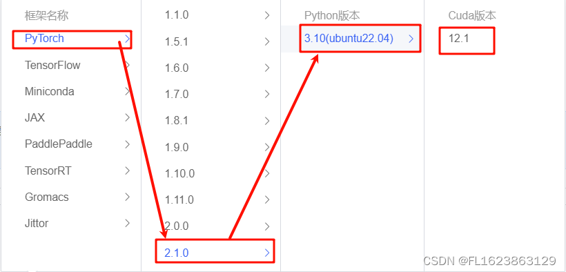 在 Autodl 平台中租赁一个 3090 等 24G 显存的显卡机器,如下图所示镜像选择 PyTorch–>2.1.0–>3.10(ubuntu22.04)–>12.1(11.3 版本以上的都可以)。