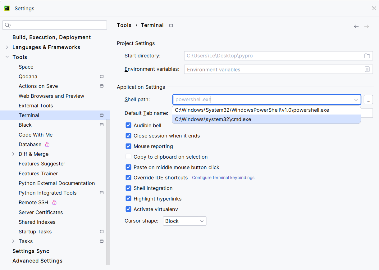 如果要修改Command Prompt的启动时访问的cmd.exe的路径,可以去Settings→Tools→Terminal中,修改Shell Path实现,改为cmd.exe的启动路径: