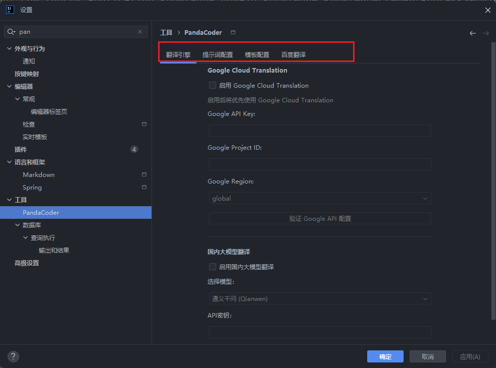 谷歌大模型、通义千问、文心一言、智谱AI,需要启用国内大模型翻译,并选择需要配置的模型,建议使用通义千问