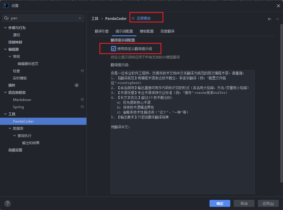 提示词配置页面配置对应的提示词,插件自带提示词设置,假如此处你有更好的提示词可以在这里进行配置,如果此处配置的不好,也可以点击还原更改将提示词进行重置。