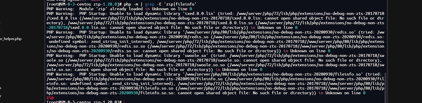 PHP Warning: PHP Startup: Unable to load dynamic library ‘zip.so’ (tried: /www/server/php/72/lib/php/extensions/no-debug-non-zts-20170718/zip.so (/www/server/php/72/lib/php/extensions/no-debug-non-zts-20170718/zip.so: cannot open shared object file: No such file or directory), /www/server/php/72/lib/php/extensions/no-debug-non-zts-20170718/zip.so.so (/www/server/php/72/lib/php/extensions/no-debug-non-zts-20170718/zip.so.so: cannot open shared object file: No such file or directory)) in Unknown on line 0 PHP Warning: PHP Startup: Unable to load dynamic library ‘/www/server/php/80/lib/php/extensions/no-debug-non-zts-20200930/fileinfo.so’ (tried: /www/server/php/80/lib/php/extensions/no-debug-non-zts-20200930/fileinfo.so (/www/server/php/80/lib/php/extensions/no-debug-non-zts-20200930/fileinfo.so: undefined symbol: zend_string_init_interned), /www/server/php/72/lib/php/extensions/no-debug-non-zts-20170718//www/server/php/80/lib/php/extensions/no-debug-non-zts-20200930/fileinfo.so.so (/www/server/php/72/lib/php/extensions/no-debug-non-zts-20170718//www/server/php/80/lib/php/extensions/no-debug-non-zts-20200930/fileinfo.so.so: cannot open shared object file: No such file or directory)) in Unknown on line 0 PHP Warning: PHP Startup: Unable to load dynamic library ‘ixed.8.0.lin’ (tried: /www/server/php/72/lib/php/extensions/no-debug-non-zts-20170718/ixed.8.0.lin (/www/server/php/72/lib/php/extensions/no-debug-non-zts-20170718/ixed.8.0.lin: cannot open shared object file: No such file or directory), /www/server/php/72/lib/php/extensions/no-debug-non-zts-20170718/ixed.8.0.lin.so (/www/server/php/72/lib/php/extensions/no-debug-non-zts-20170718/ixed.8.0.lin.so: cannot open shared object file: No such file or directory)) in Unknown on line 0 PHP Warning: PHP Startup: Unable to load dynamic library ‘/www/server/