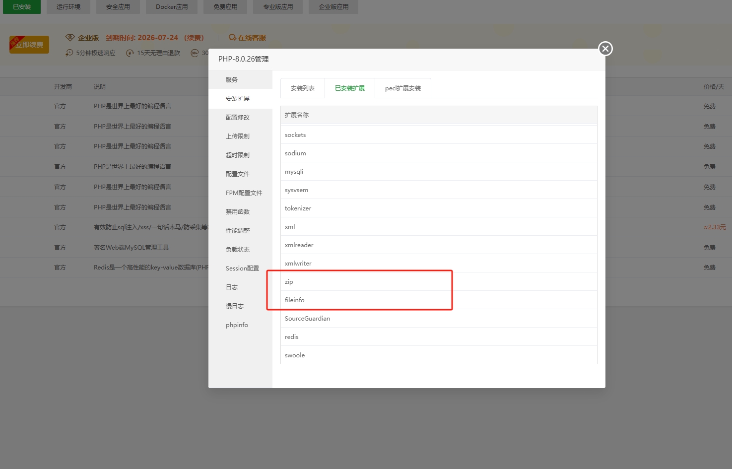 针对特别是 zip.so 和 fileinfo.so 扩展未能正确加载。以下是完整的解决方案: