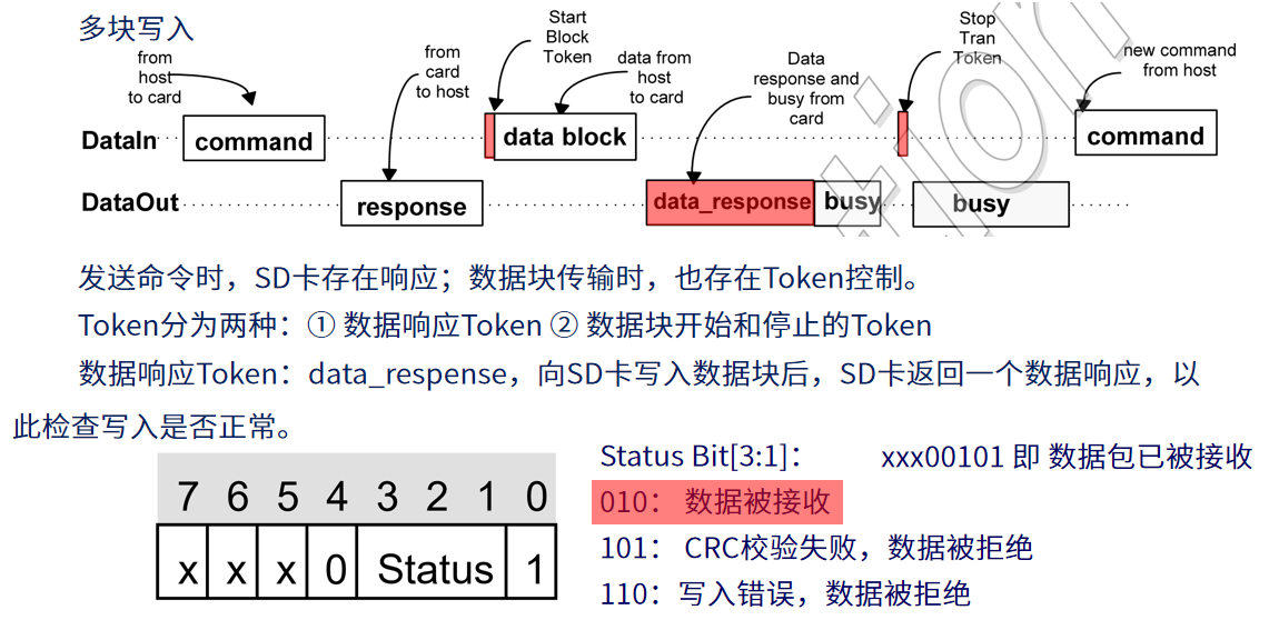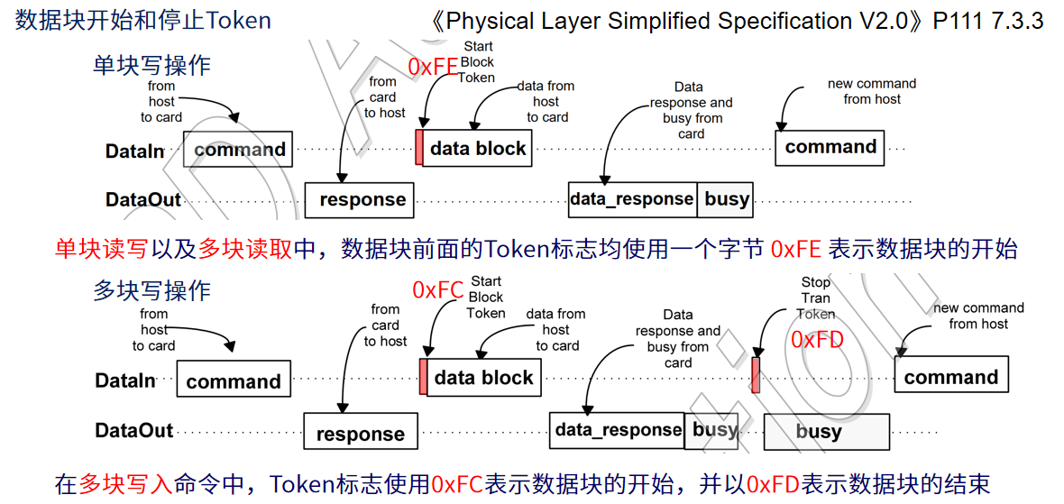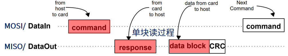 数据:主机发送的数据 / SD发送的数据。SD数据是以块(Block)形式传输,SDHC卡数据块长度一般为512字节。数据块需要CRC保证数据传输成功。