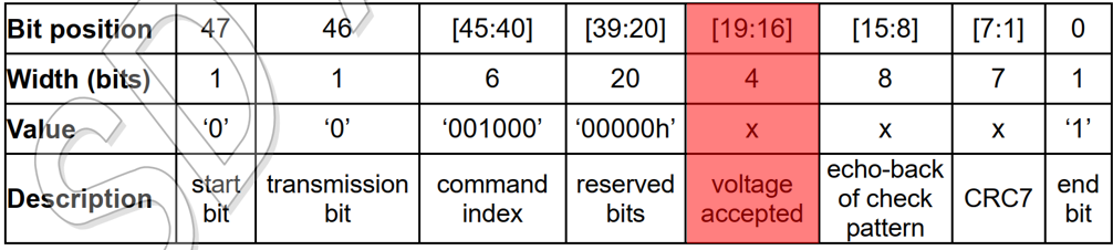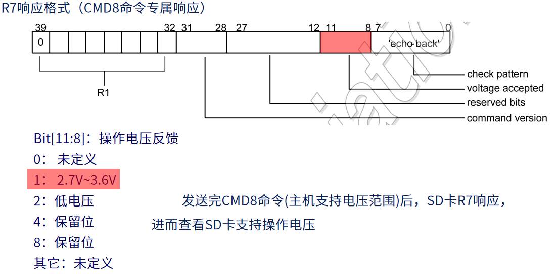 R7响应:专用于命令CMD8的响应,返回卡支持电压范围和检测模式