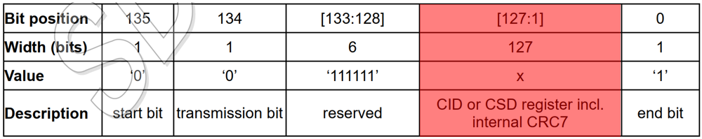 R2响应:CID寄存器内容作为CMD2和CMD10响应,CSD寄存器内容作为CMD9响应