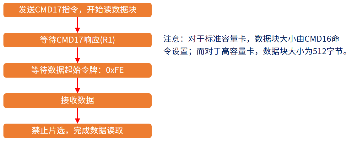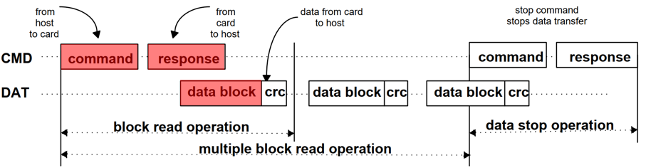 数据:主机发送的数据 / SD卡发送的数据。SD卡数据是以块(Block)形式传输,SDHC卡数据块长度一般为512字节。数据块需要CRC保证数据传输成功。