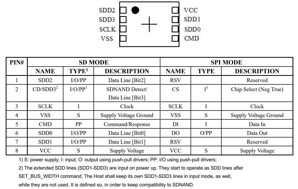 芯片各引脚的功能及用途如图所示,由此可知该芯片能支持两种读写方式,即SD模式和SPI模式。