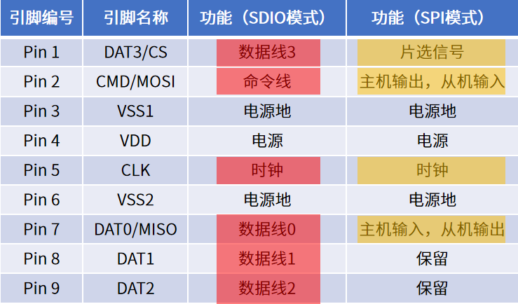 微处理器对SD卡进行操作,可通过SPI接口、SDIO接口。不同接口,SD卡引脚功能不一样。