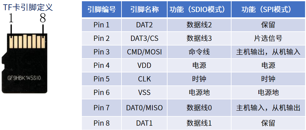 TF卡只比SD卡少了一个电源引脚VSS2,其他引脚功能类似。SD卡和TF卡只有引脚和形状大小不同,内部结构类似,操作时序完全相同,可用完全相同的代码驱动