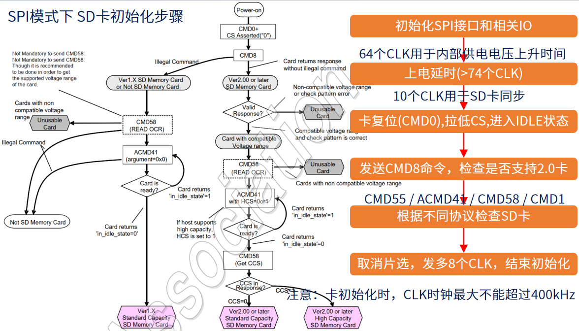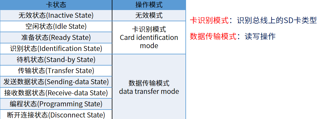 系统复位后,主机和SD卡都处于卡识别模式,主机在总线上找设备;当SD卡被主机识别后,SD卡进入到数据传输模式,而主机在总线上所有卡都被识别后也进入数据传输模式。