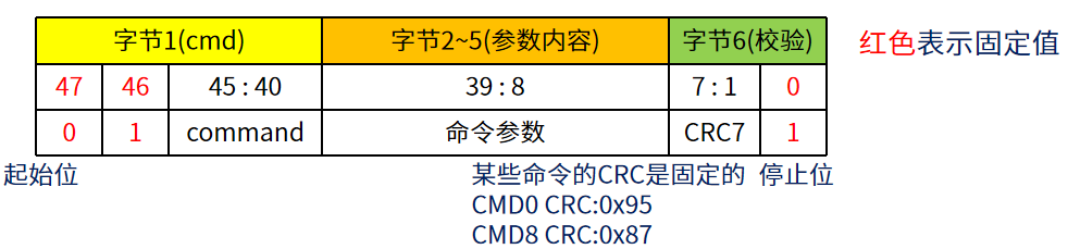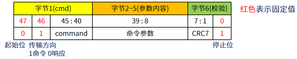 Byte1:命令字的第一个字节为命令号(如CMD0、CMD1等),格式为“0 1 x x x x x x”
