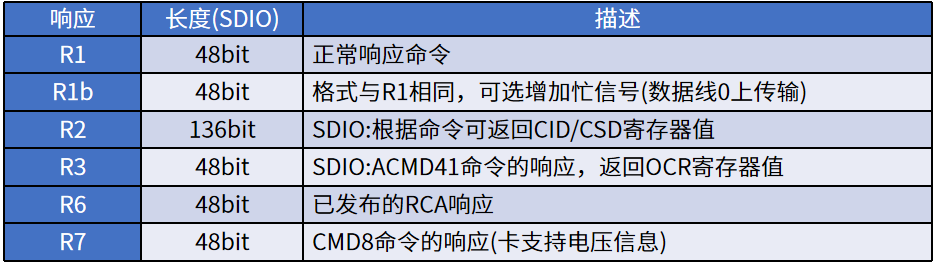 SD卡响应因使用接口不同,格式也不同。响应具体有R1、R1b、R2、R3、R7。响应内容大小可以分为短响应48bit和长响应136bit。