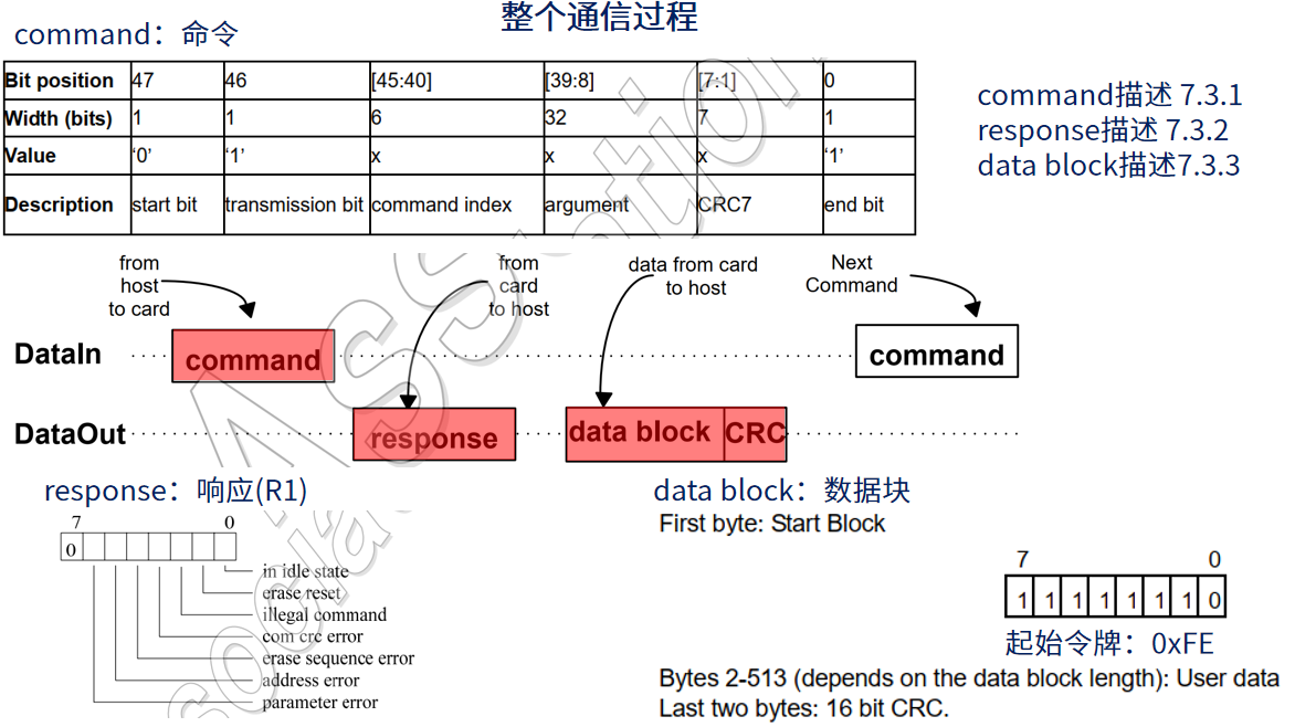 命令:应用相关命令(ACMD)和通用命令(CMD),通过命令线DataIn传输,固定长度48位。