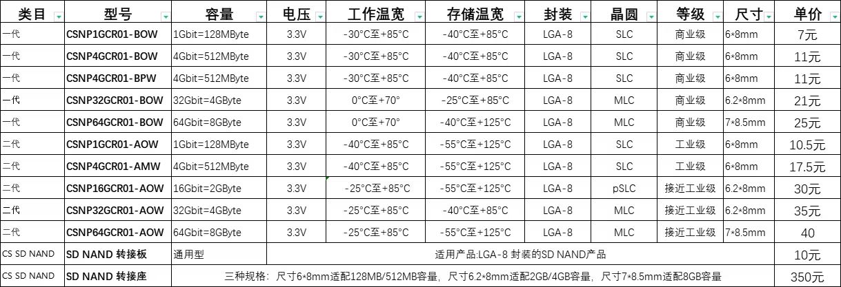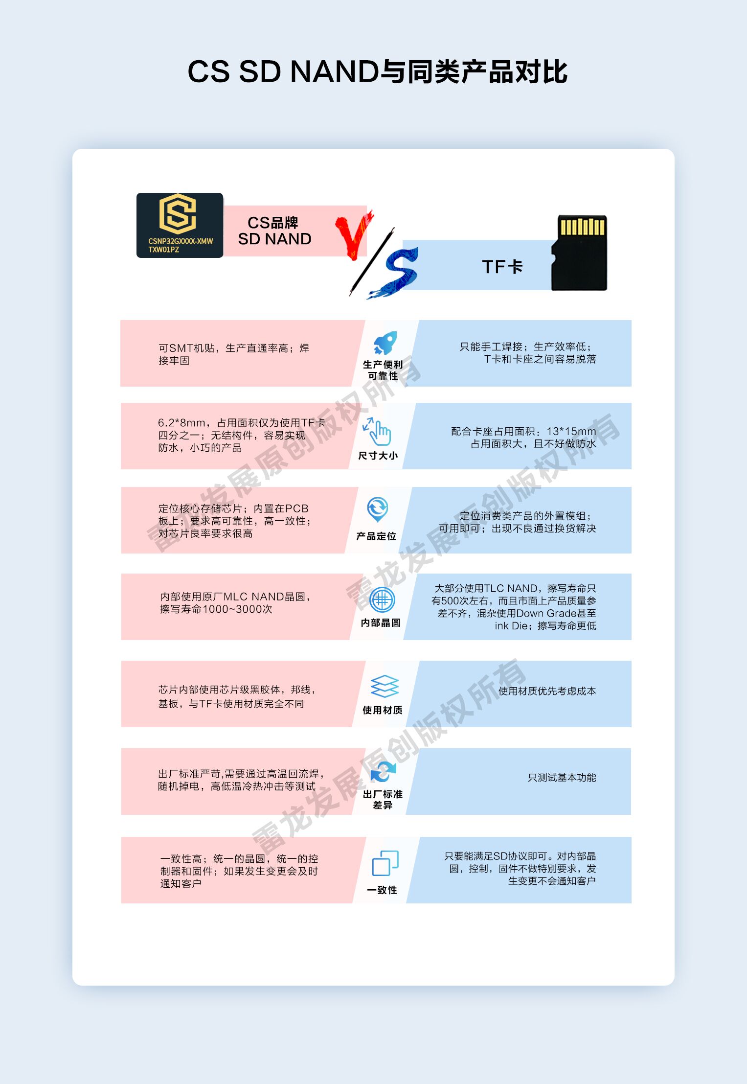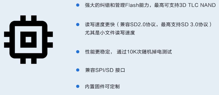 使用pSLC技术,拥有高容量的同时兼具SLC的特性,不用写驱动程序自带坏块管理的NAND Flash(贴片式TF卡),尺寸小巧,简单易用,兼容性强,稳定可靠,固件可定制,LGA-8封装,标准SDIO接口,兼容SPI,兼容拔插式TF卡/SD卡,可替代普通TF卡/SD卡,尺寸6.2x8mm,内置平均读写算法,通过1万次随机掉电测试,耐高低温,机贴手贴都非常方便,速度级别Class10,标准的SD 2.0协议使得用户可以直接移植标准驱动代码,省去了驱动代码编程环节。支持TF卡启动的SOC都可以用SD NAND,提供STM32参考例程及原厂技术支持,容量:2GB,比TF卡稳定,比eMMC易用。