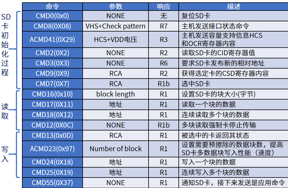 SD卡有8个寄存器,但不能直接进行读写操作,需要通过命令来控制。SD卡协议定义了一些命令用于实现某一特定功能,SD卡根据收到的命令要求对内部寄存器进行修改。