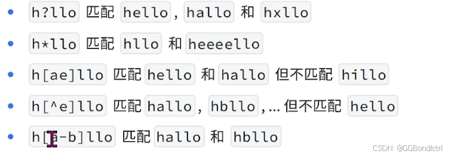 ?匹配一个字符 *匹配一个0-个或者多个任意字符 [ac]匹配ae,别的不可以进行匹配 [^e]排除E,只有E不可以进行匹配 [a-b]匹配A到B这个范围内的字符,是闭区间