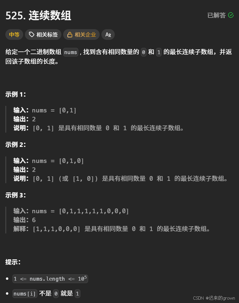 nums,其中nums[i]不是0就是1。 我们要找到含有相同数量的0和1的子数组,并且返回该子数组的长度。