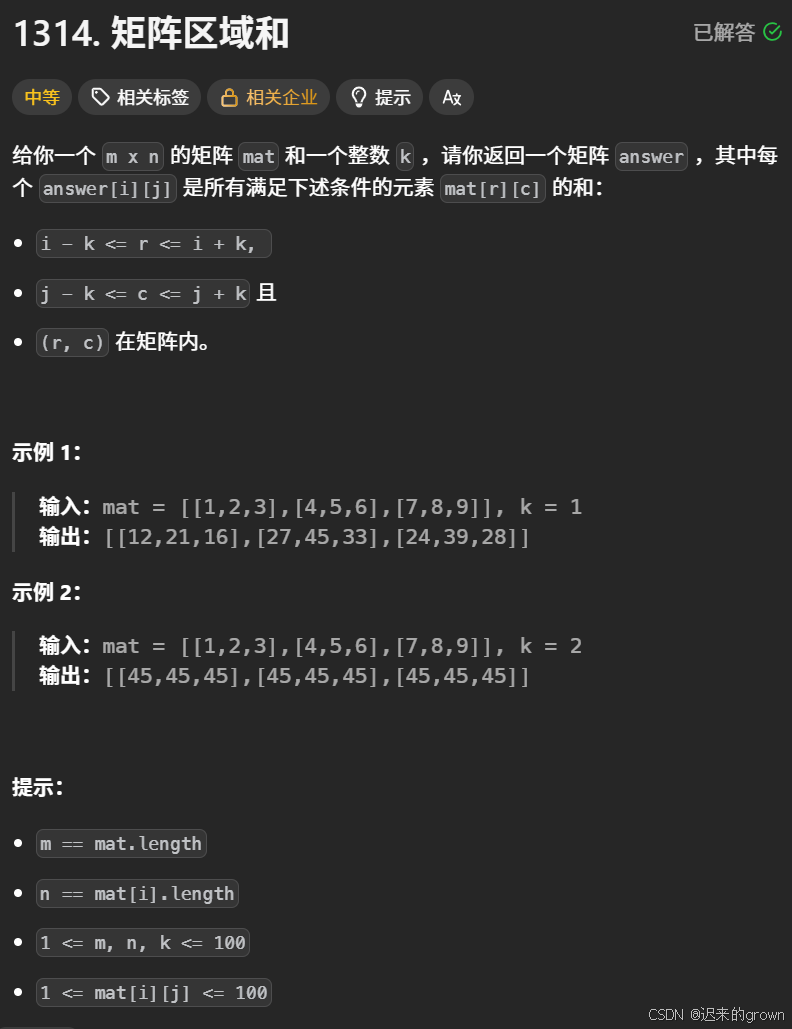 m*n的矩阵nums和一个整数k,让我们返回一个矩阵answer; 其中answer[i]是nums中满足条件的nums[r][c]的和;(i-k <= r <= i+k、j-k <= c <= j+k) 简单来说就是nums中,子矩阵中所有数的和。
