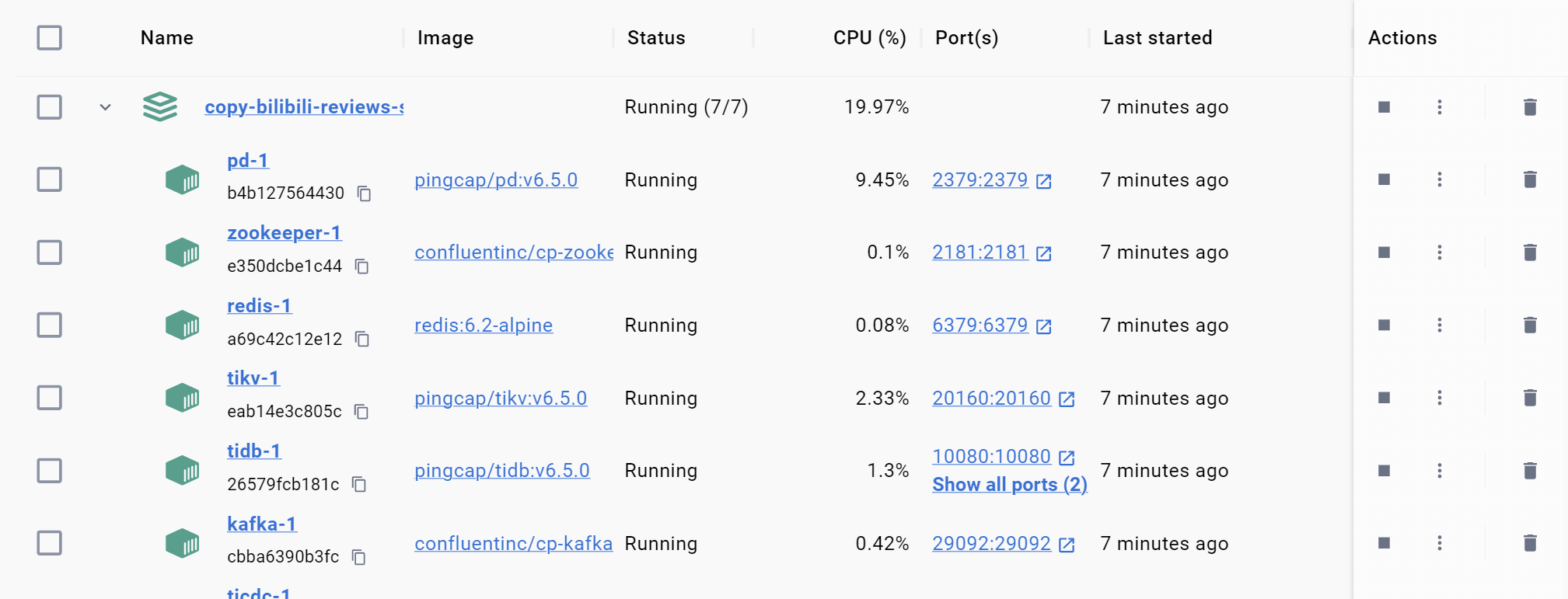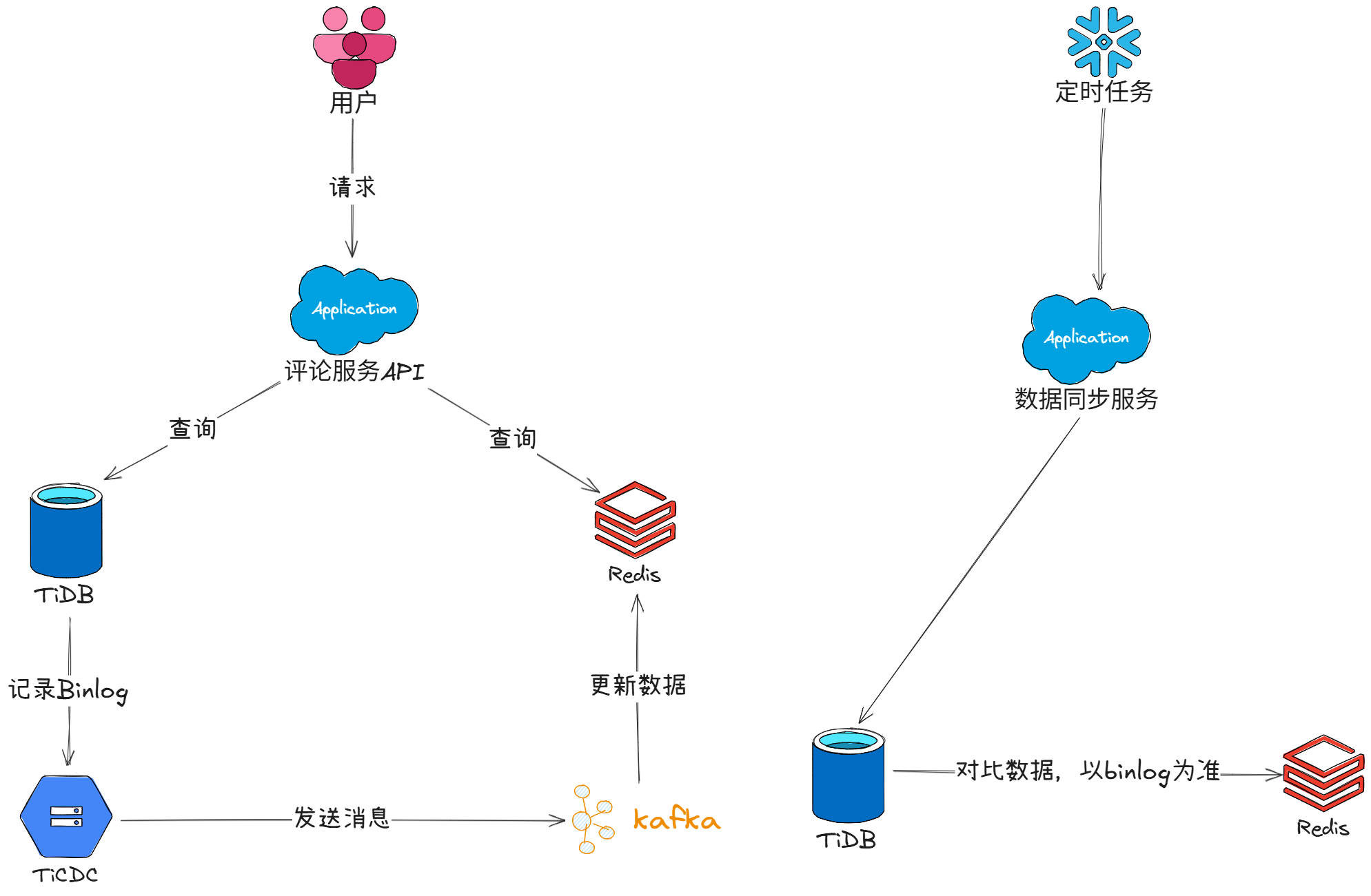 TiDB 集群,为最大程度还原原架构,选用其原生分布式数据库TiDB。其水平扩展能力能无缝支撑高并发场景。如果读者对MySQL更熟悉,可以将主存储替换为MySQL集群,数据同步工具可选用Debezium来替代TiCDC。Redis Cluster,作为B站自研存储“泰山KV”的开源替代品。其高性能的Key-Value读写及Sorted Set数据结构,是实现缓存和热点排行的理想选择。TiCDC,TiDB官方的增量数据同步工具,负责捕获binlog变更并将其推送到下游。Kafka,作为行业标准的消息中间件,用于解耦CDC组件与消费端应用,提供数据缓冲与高可用性保障。Spring Boot 应用,可使用spring-kafka库以消费消息,并通过 Lettuce 或 Jedis 等客户端将数据变更应用至Redis Cluster。分布式定时任务框架 (如 XXL-Job),负责定期触发数据比对与修复流程,保障主存储与二级存储的最终一致性。理论最终要通过实践来检验。现在,我们将亲手搭建并实现这套评论系统的核心架构。