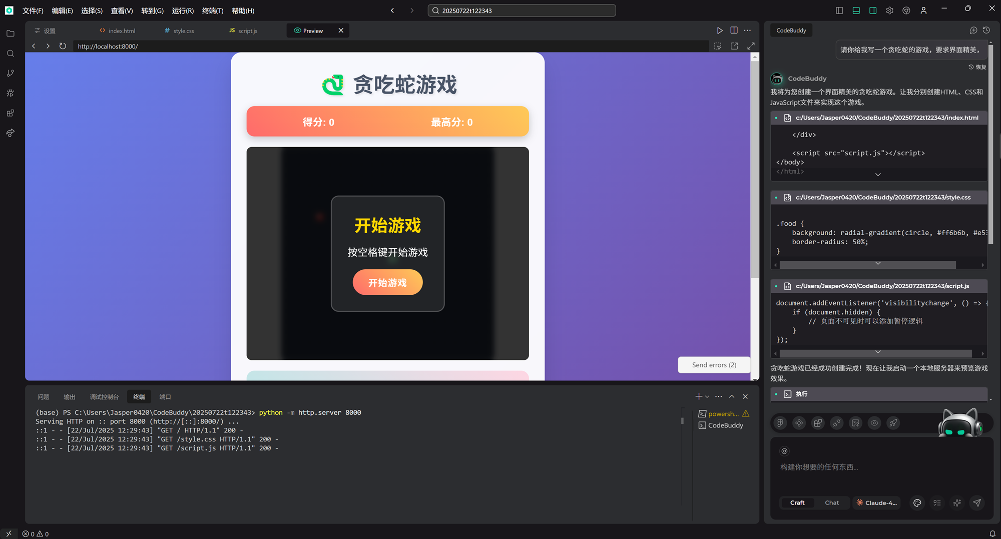 持久化最高分,并为打破记录设计了特殊的提示。最难能可贵的是,CodeBuddy 的设计充满了对用户体验(UX)的关怀。从吃食物的视觉反馈、按钮的交互动画,到防止玩家误操作(如蛇头反向移动),再到多平台控制的兼容性,无不体现出其设计的人性化。它甚至考虑到了性能优化,如合理的游戏循环帧率和及时的内存管理。