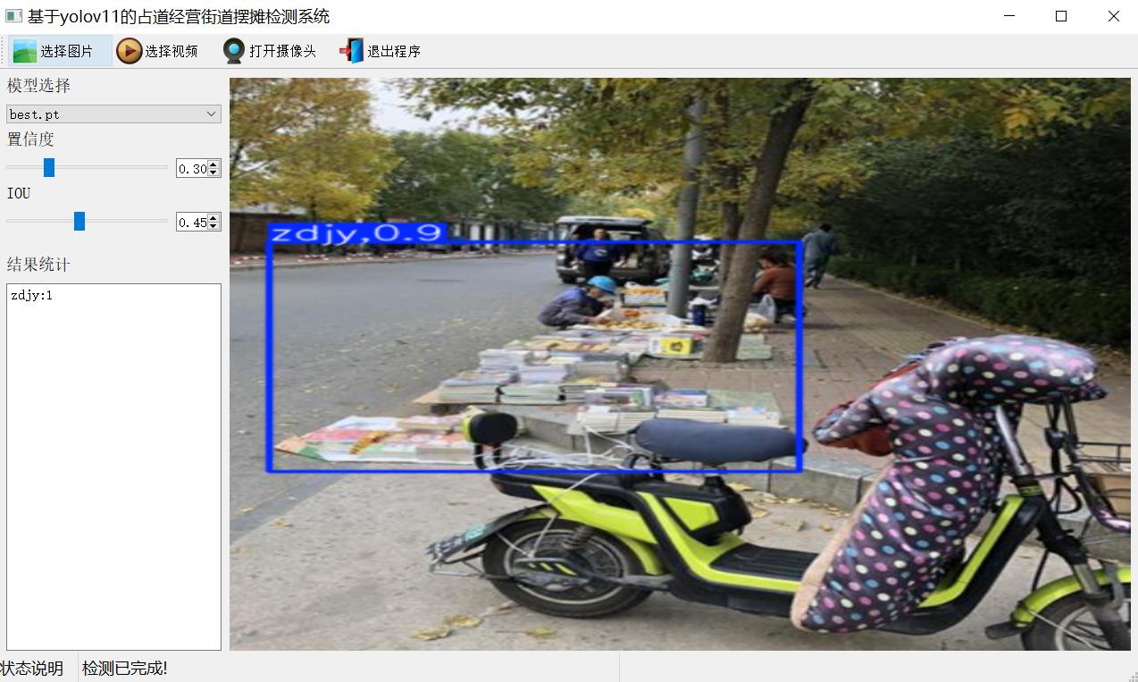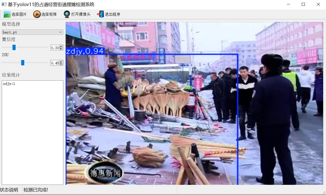 此系统能够精准识别“zdjy(占道经营)”这一类别。它可以准确捕捉占道经营摊位的各种形态特征,无论是摊位部分超出经营区域边界,还是完全堵塞交通要道;无论是售卖水果、小吃的小型摊位,还是售卖衣物、日用品的大型摊位,系统都能敏锐识别。通过对大量街道占道经营图像数据的学习和训练,系统能够保持较高的检测准确率,即便在光线变化大、人流量密集、存在各种遮挡物等复杂场景下,也能稳定发挥检测性能。