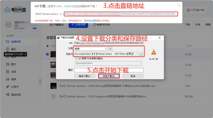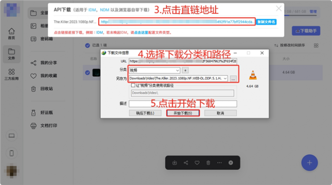 在新弹出的窗口中,点击解析完成的“直链地址”。选择文件分类和保存路径,点击“开始下载”按钮,即可将阿里云盘中的电影高速下载到本地硬盘。