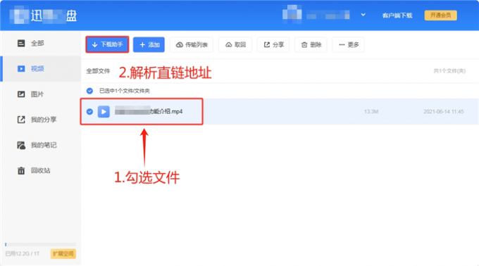 打开迅雷云盘的文件列表,选择文件并点击左上角的“下载助手”按钮。在解析列表中,选择“API 下载”。
