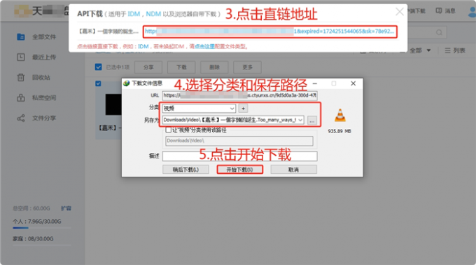 在新弹出的窗口中,点击解析完成的“直链地址”。在 IDM 的下载信息窗口中,选择文件分类和保存路径,点击“开始下载”按钮,即可将天翼云盘中的文件高速下载到本地保存。
