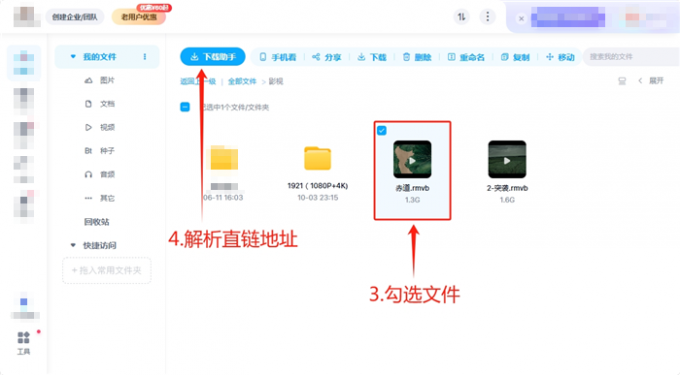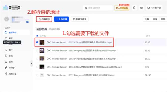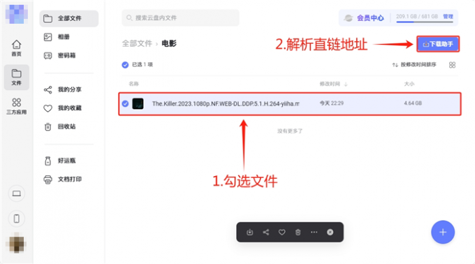 打开夸克网盘,勾选文件并点击左上角的“下载助手”按钮。在解析列表中,选择“API 下载”。