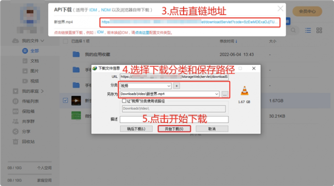 点击上方“直链地址”,IDM 的下载信息窗口便会自动弹出。选择文件分类和保存路径,点击“开始下载”按钮,即可将移动云盘中的文件高速下载到本地保存。