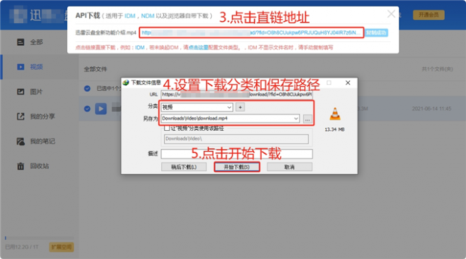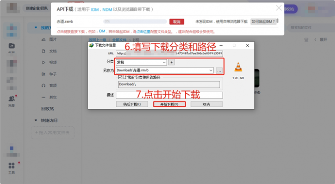 点击“直链地址”后,IDM 的下载信息窗口便会自动弹出。选择文件分类和保存路径,点击“开始下载”按钮,即可将迅雷云盘中的文件高速下载到本地保存。