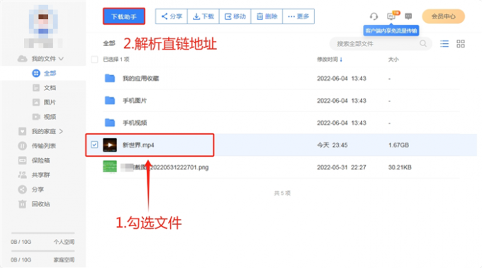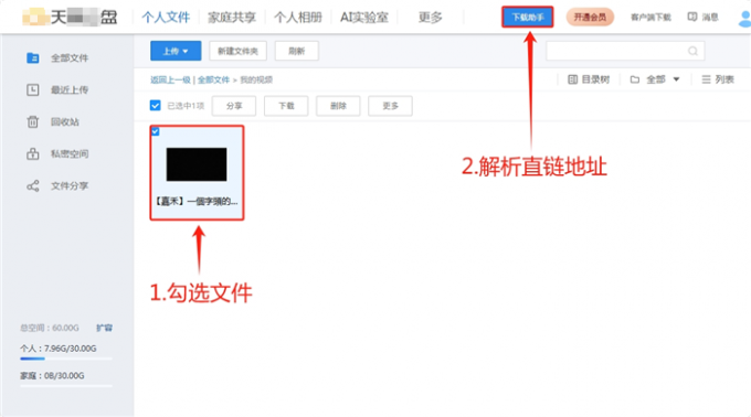 打开天翼云盘,勾选文件并点击上方的“下载助手”按钮。在解析列表中,选择“API 下载”。