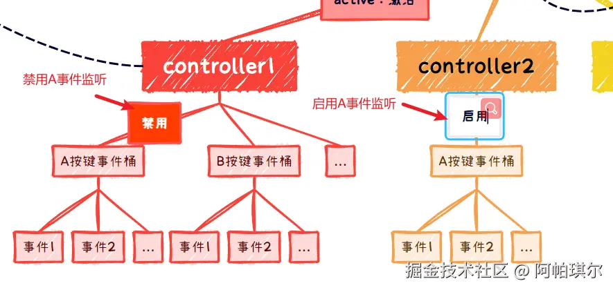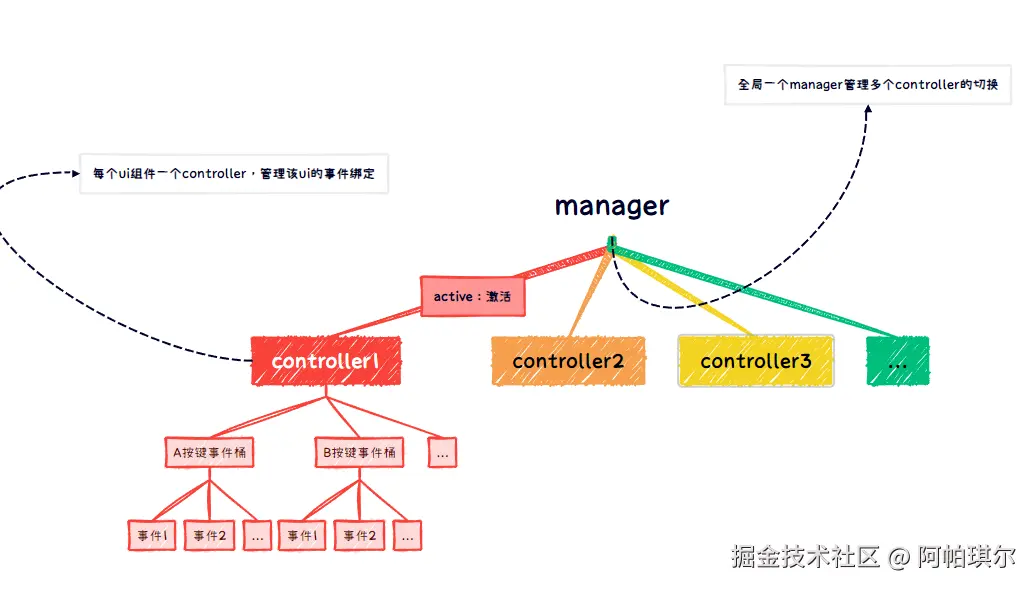 全局一个manager管理多个ui组件的事件(controller)切换,切换某个controller,就只触发该controller下的事件,这样就能实现像星铁一样切换事件