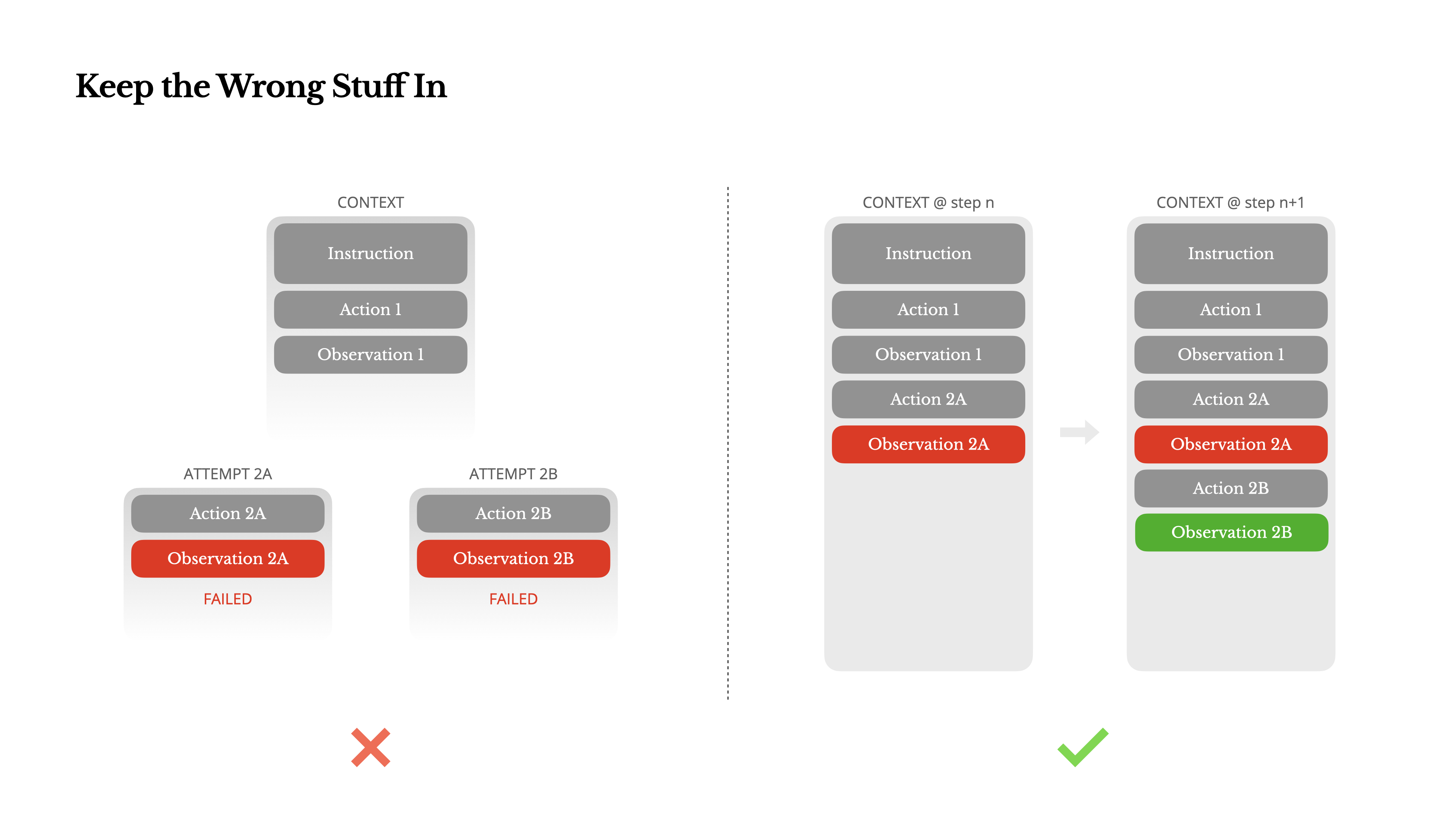 语言模型是非常优秀的模仿者;它们会模仿上下文中行为模式。如果你的上下文中充满了相似的过去“动作-观察”对,模型就会倾向于遵循这种模式,即使它不再是最优的。
